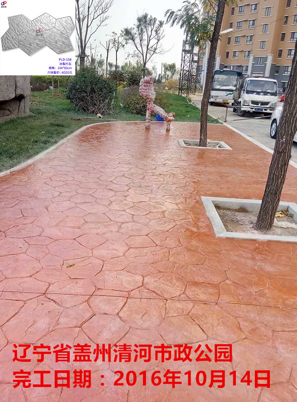 項(xiàng)目名稱:遼寧省蓋州清河市政公園壓花壓模地坪工程 項(xiàng)目地址:遼寧省蓋州 竣工時(shí)間: