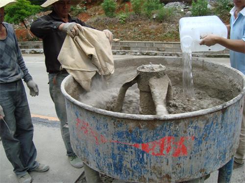 根據(jù)修補(bǔ)區(qū)域面積計(jì)算所需修補(bǔ)材料用量(以單塊路面板為單位計(jì)算),盡量做到一次性鋪裝。鋪裝工序及坑槽充分吸水飽和且無明水時(shí)進(jìn)行材料攪拌。用攪拌機(jī)先干拌SC型修補(bǔ)料和干凈碎石,修補(bǔ)料與碎石質(zhì)量比為1:0.8/1(碎石是直徑在10-30㎜連續(xù)級(jí)配石子,還要經(jīng)水清洗過),攪拌均勻后,再加干凈的水?dāng)嚢?,加水量以檢測(cè)報(bào)告提供的數(shù)據(jù)為依據(jù),直至攪拌均勻。觀察無干粉球和氣泡,如果仍有干粉球和氣泡,可靜止一分鐘后再攪拌,攪拌時(shí)間在3-5分鐘左右為宜,不宜時(shí)間過長(zhǎng),防止材料在攪拌機(jī)內(nèi)凝固。注意控制好水灰比,攪拌好的修補(bǔ)料不得泌水。